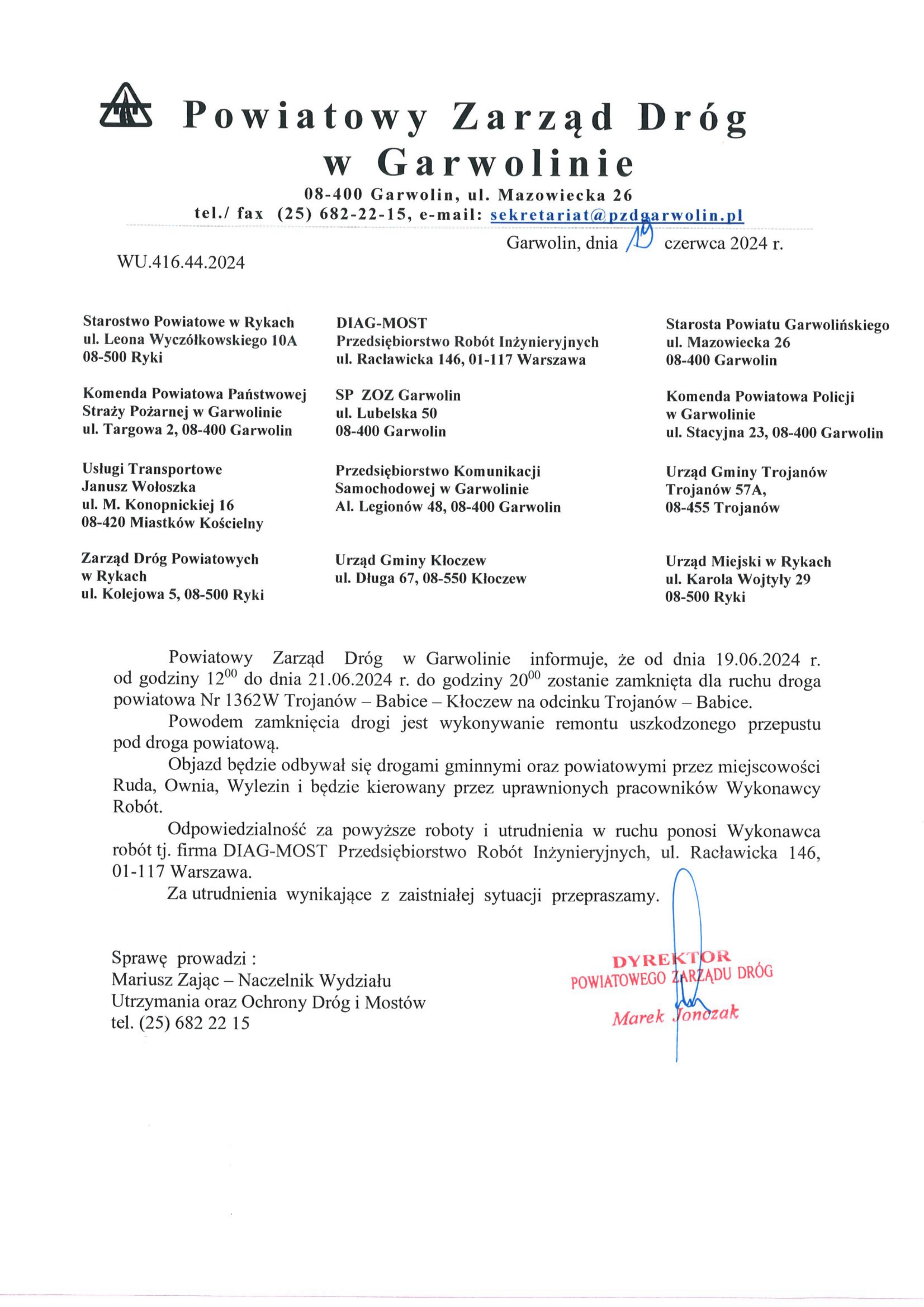 Zarząd Dróg w Garwolinie informuje, że do dnia 19.06.2024 r. od godz. 1200 do dnia 21.06.2024 r. do godz. 2000 zostanie zamknięta dla ruchu droga powiatowa Nr 1362W Trojanów – Babice – Kłoczew na odcinku Trojanów – Babice.