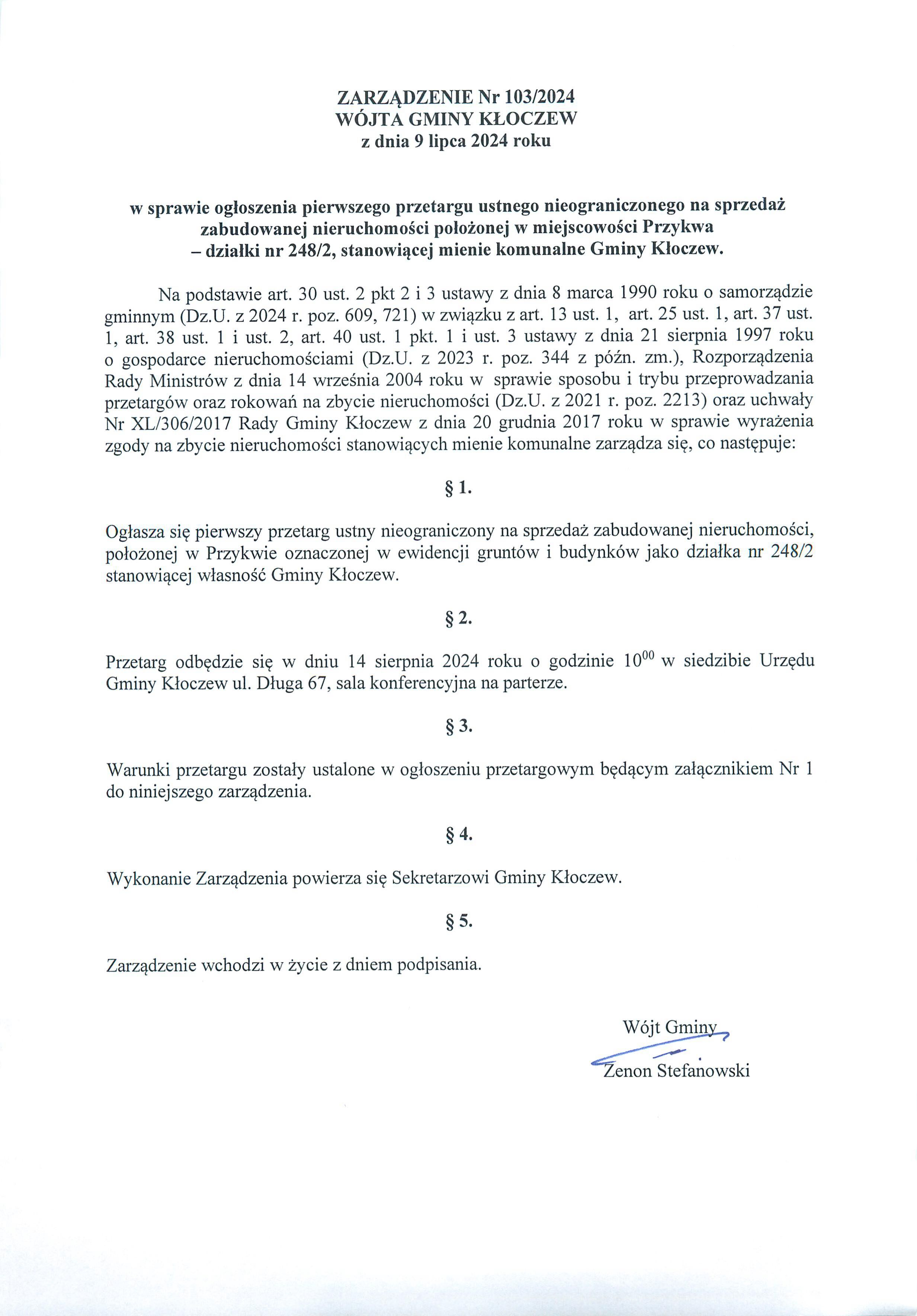 Zarządzenie Wójta Gminy Kłoczew z dnia 9 lipca 2024 roku w sprawie ogłoszenia pierwszego przetargu ustnego nieograniczonego na sprzedaż zabudowanej nieruchomości położonej w miejscowości Przykwa - działki 248/2, stanowiącej mienie komunalne Gminy Kłoczew