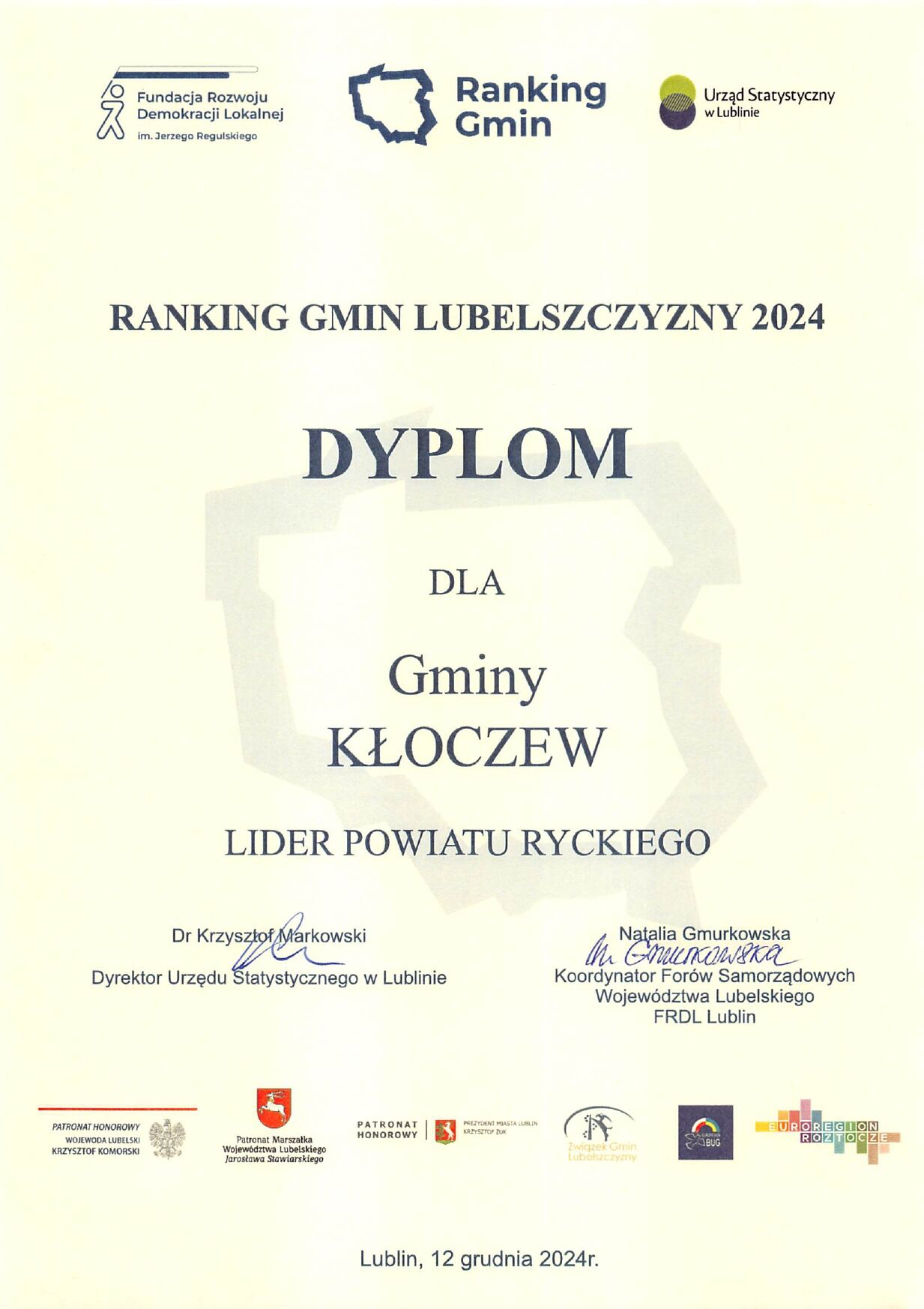 Gmina Kłoczew zajęła 1 miejsce w powiecie i tym samym została Liderem Powiatu Ryckiego.