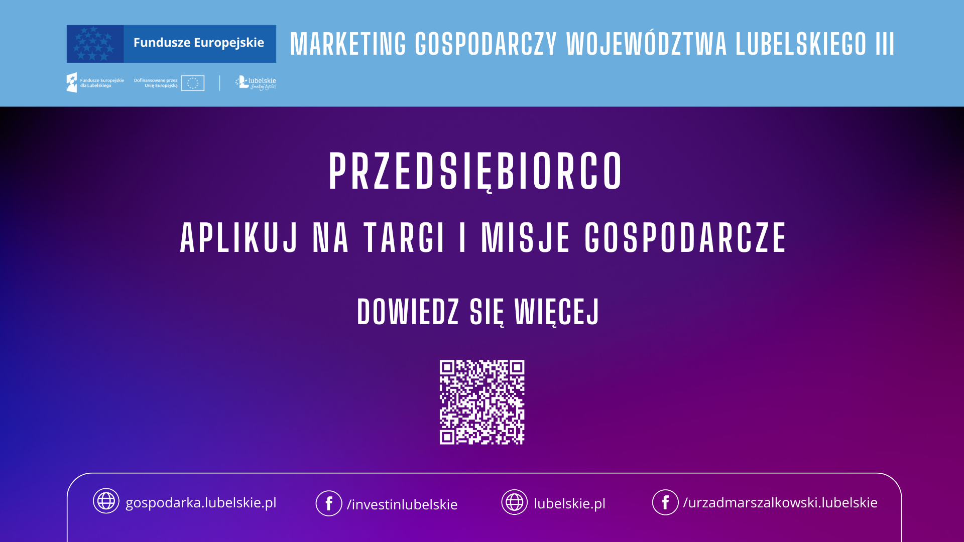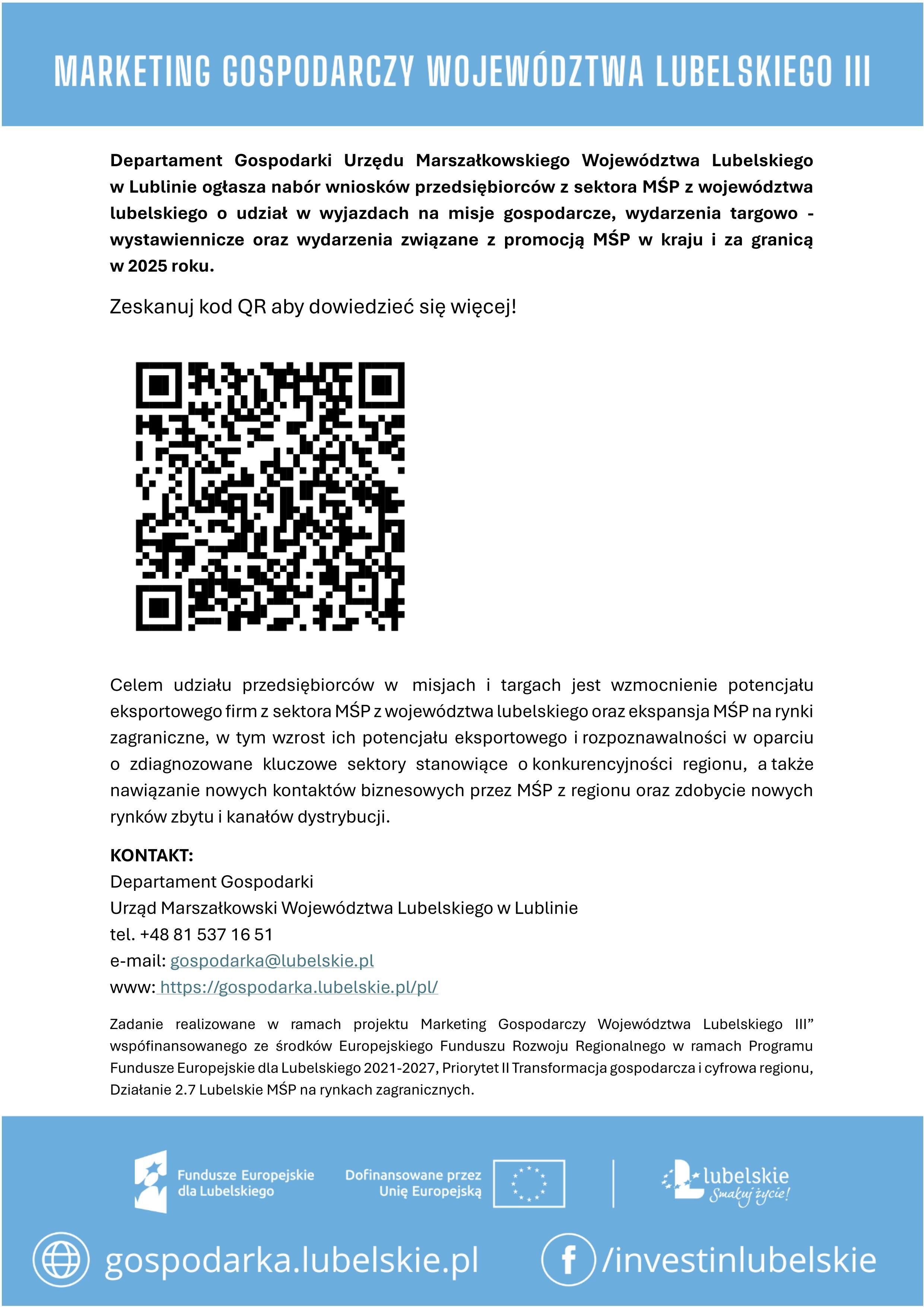 Departament Gospodarki Urzędu Marszałkowskiego Województwa Lubelskiego w Lublinie ogłosił nabór wniosków przedsiębiorców z sektora MŚP z województwa lubelskiego o udział w wyjazdach na misje gospodarcze, wydarzenia targowo - wystawiennicze oraz wydarzenia związane z promocją MŚP w kraju i za granicą w 2025 roku.