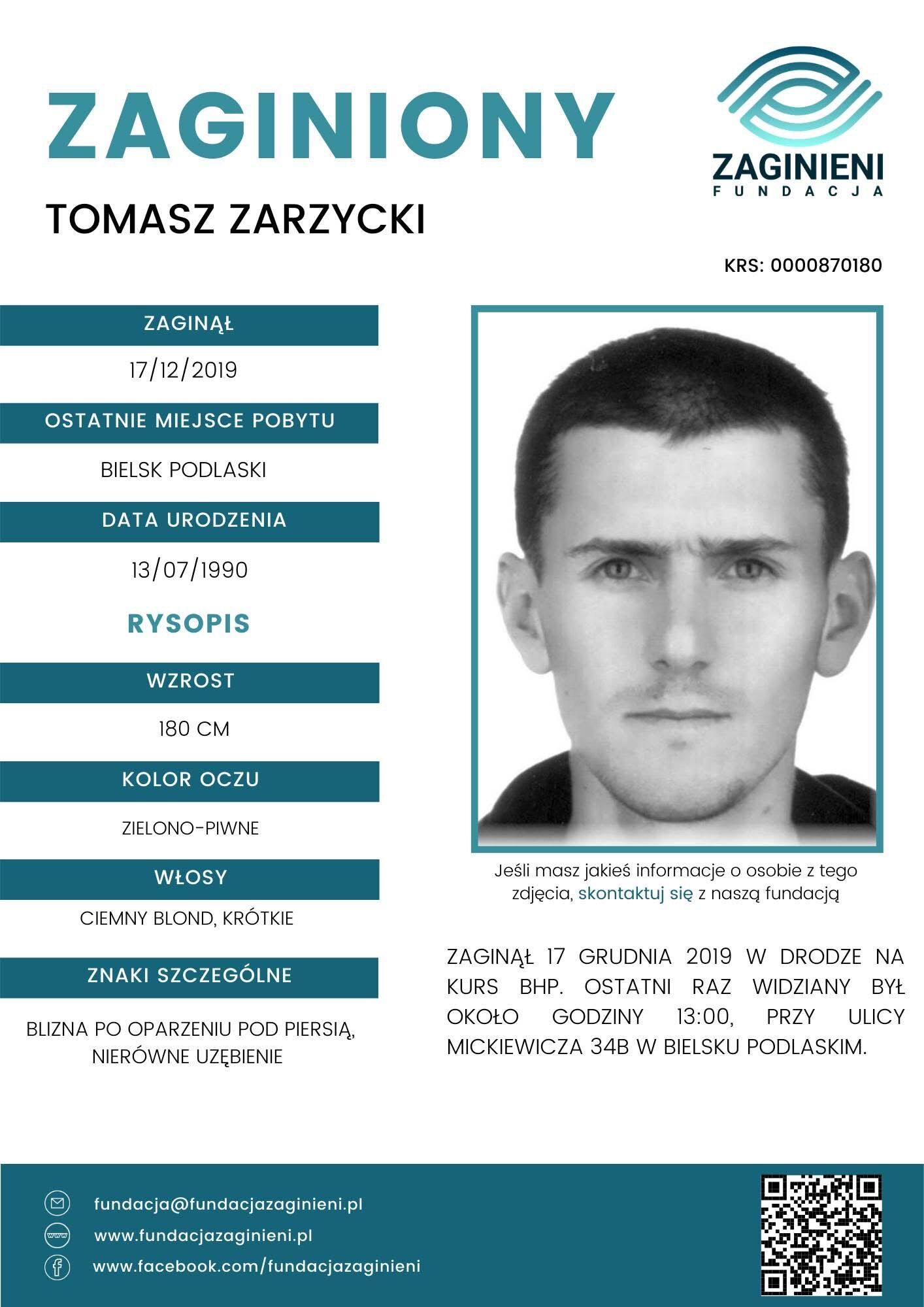 Fundacji Zaginieni zajmuje się kompleksowym poszukiwaniem osób zaginionych w Polsce i za granicą. Na prośbę rodziny prowadzi poszukiwania Tomasza Zarzyckiego. Ostatni raz widziany był 17.12.2019 roku w Bielsku Podlaskim.
