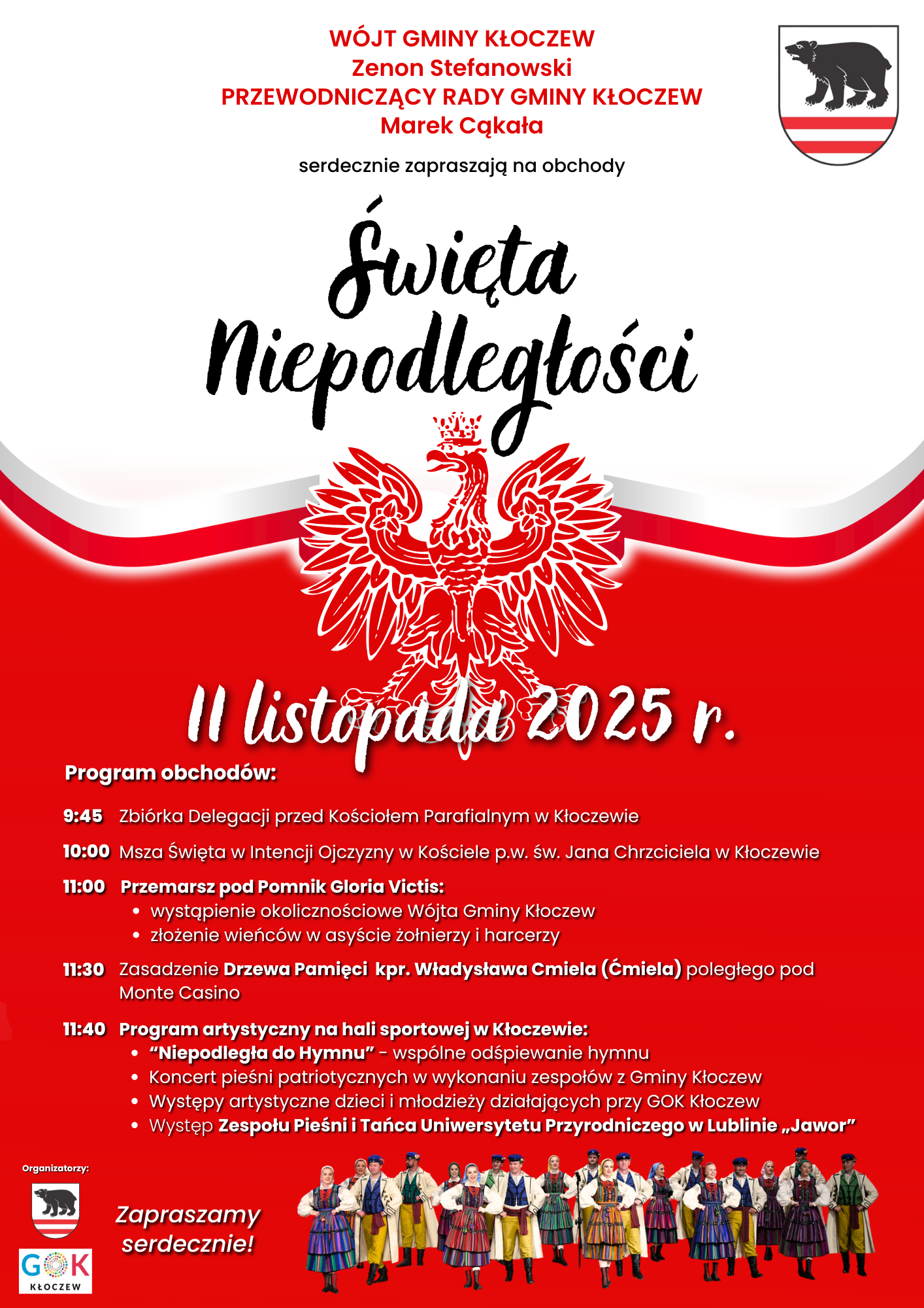 Wójt Gminy Kłoczew i Przewodniczący Rady Gminy Kłoczew serdecznie zapraszają na obchody ŚWIĘTA NIEPODLEGŁOŚCI. Szczegółowy program uroczystości znajdą Państwo na plakacie.