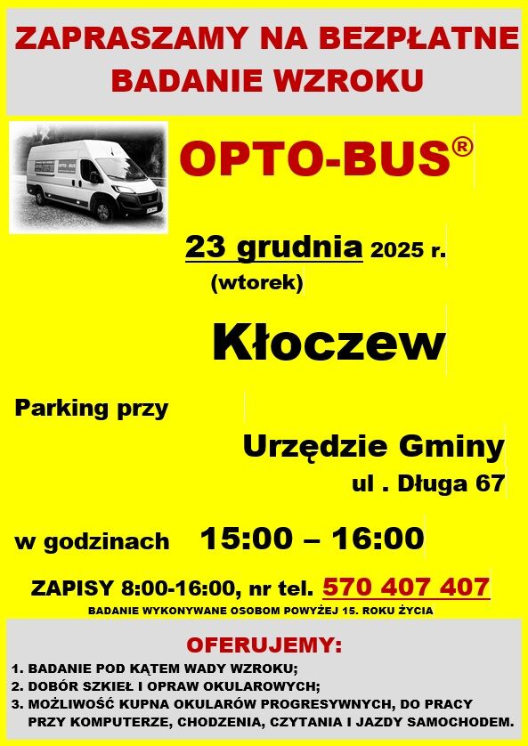 Informujemy, że 23 grudnia będą przeprowadzane bezpłatne badania wzroku dla mieszkańców. Optobus będzie dostępny na parkingu przed UG Kłoczew w godzinach 15:00 - 16:00. Obowiązują zapisy telefoniczne. Szczegóły na plakacie.
