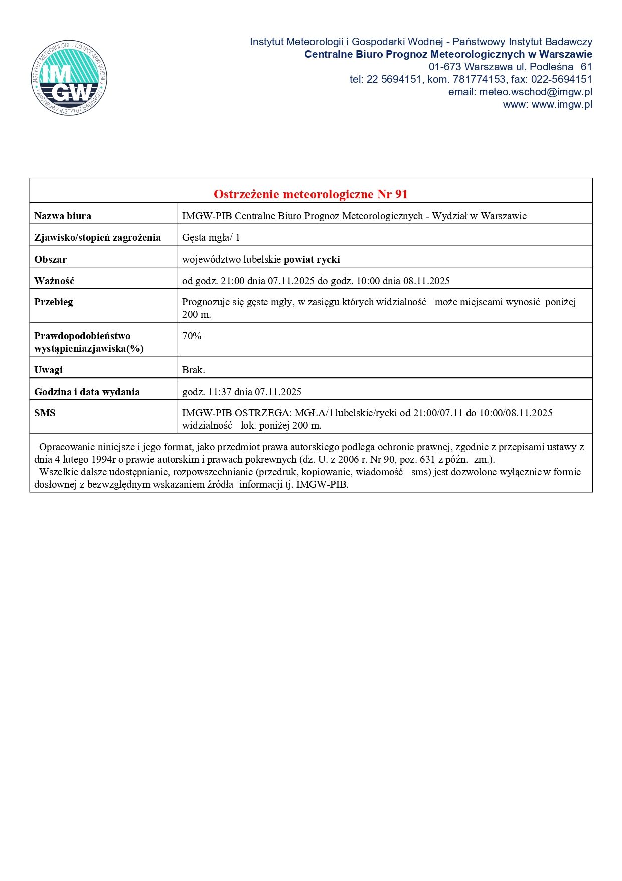 Prognozuje się gęste mgły, w zasięgu których widzialność może miejscami wynosić poniżej 200 m. od godz. 21:00 dnia 07.11.2025 do godz. 10:00 dnia 08.11.2025.
