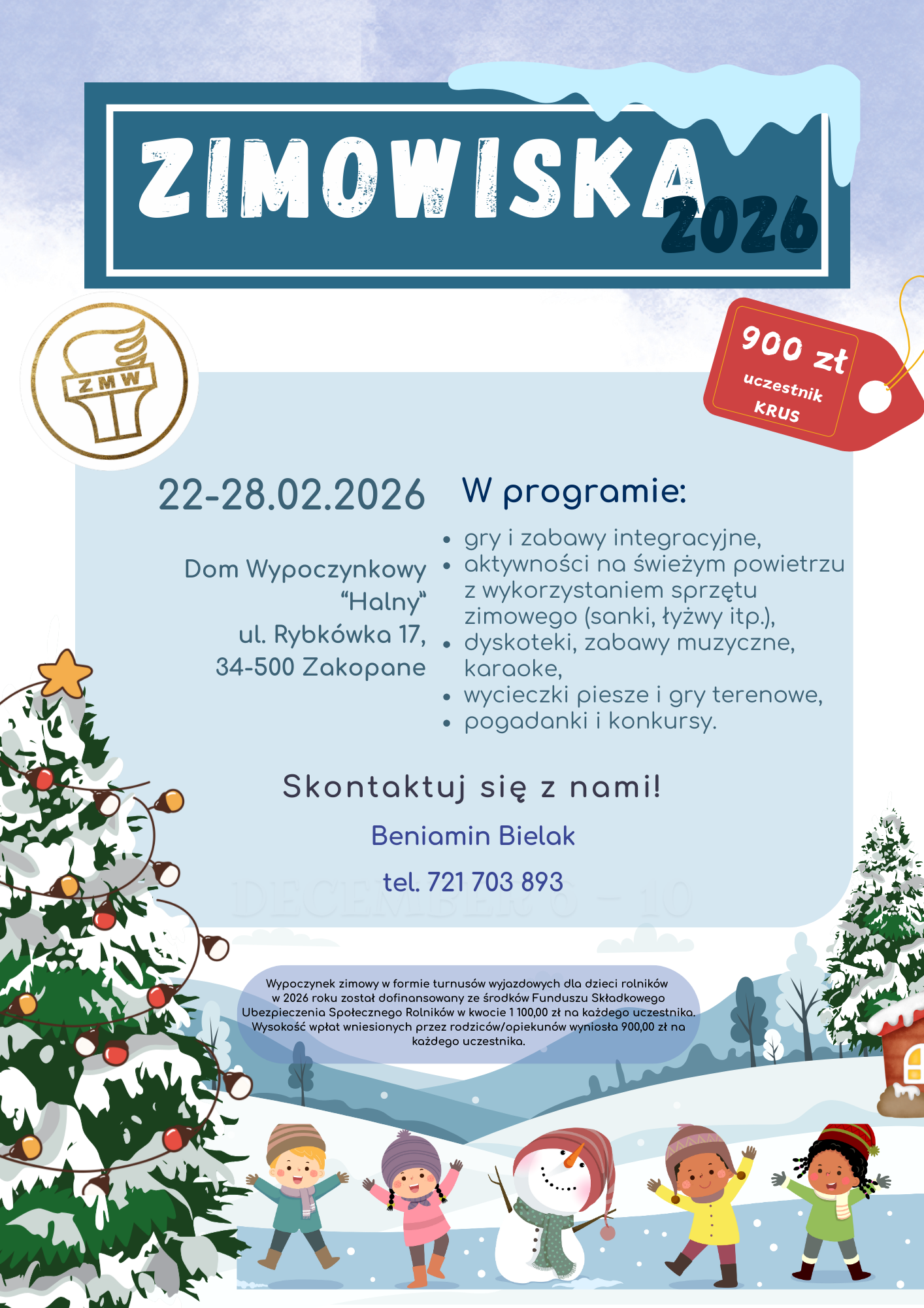 Wypoczynek zimowy w formie zimowisk dla dzieci rolników w 2026 roku został dofinansowany ze środków Funduszu Składkowego Ubezpieczenia Społecznego Rolników w kwocie 1 100,00 zł na każdego uczestnika. W wypoczynku mogą również brać udział dzieci, których rodzice nie podlegają ubezpieczeniu KRUS. W takim wypadku występuje pełna odpłatność za turnus (2 000,00 zł).